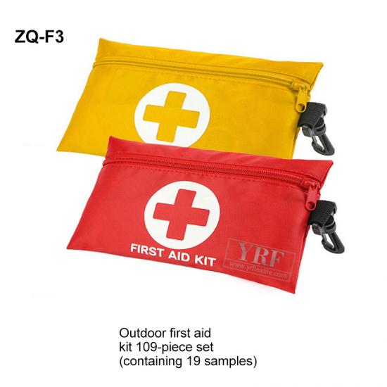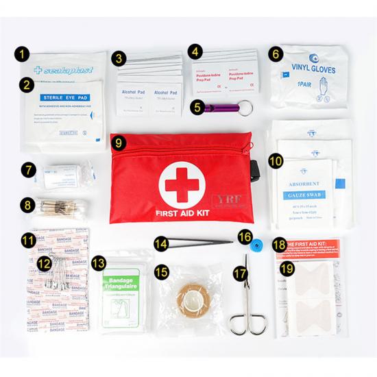 Almohadilla para chupar sangre *1, Almohadilla para los ojos *1, Tabletas de alcohol *20, Tabletas de yodóforo *10, Silbato de supervivencia *1, Guantes desechables *1, Vendaje PBT *1, Hisopo de algodón *30, Botiquín de primeros auxilios *1, Gasa (tres tamaños) *6, Curita *15, Imperdible *10, Vendaje triangular *1, Pinzas *1, Vendaje autoadhesivo *1, Torniquete *1, Tijeras *1, Instrucciones *1, Curita mariposa *5, Cinta de papel *1