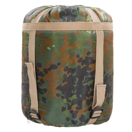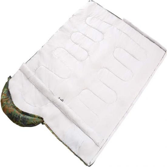 El relleno del saco de dormir, fabricado en China, es fibra de poliéster de 400 g/m² con una resistencia a la temperatura de -6 °C. Puede elegir entre azul cielo, gris oscuro, rojo y estampado de camuflaje para la cremallera izquierda, y morado, naranja, verde y verde militar para la derecha.