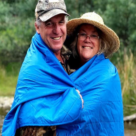 R: La manta azul impermeable mide 82 x 55 pulgadas y es adecuada para dos personas.