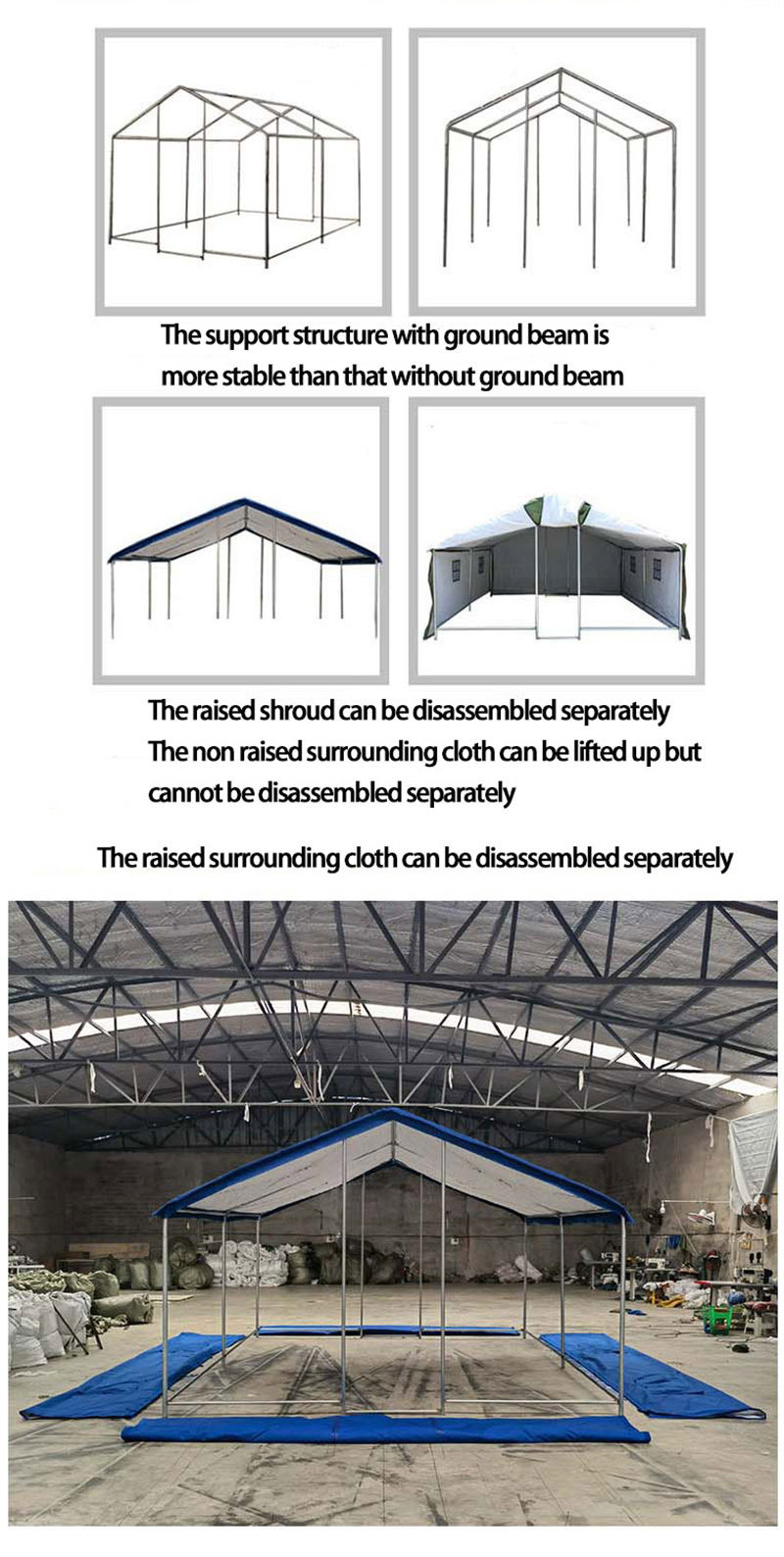 Tienda de Emergencia, un recurso esencial en numerosas situaciones críticas. En situaciones de emergencia, como huracanes o tsunamis, proporciona refugio inmediato y seguro a los afectados. Los militares la utilizan como campamentos de despliegue rápido durante las misiones. Los equipos médicos la utilizan como clínicas improvisadas para primeros auxilios y tratamiento. También es un elemento clave en las donaciones de las Naciones Unidas, las reservas gubernamentales para la preparación ante desastres y las operaciones de la Cruz Roja. Esta tienda presenta un diseño fácil de ensamblar, lo que permite una instalación rápida incluso en las circunstancias más urgentes. Además, está disponible en una amplia gama de colores, lo que le permite elegir la que mejor se adapte a sus necesidades. Su fabricación de alta calidad garantiza durabilidad y un rendimiento duradero.