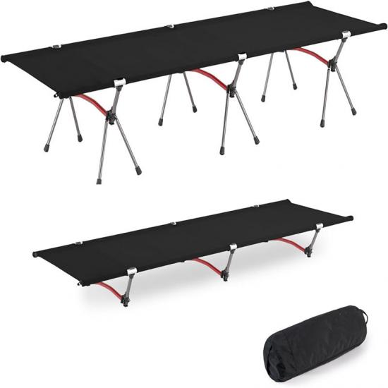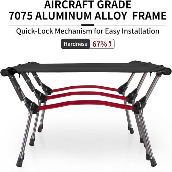 Nuestra cama plegable portátil para desastres está fabricada con aleación de aluminio 7075 de grado aeronáutico como material de la estructura. Este metal de alta calidad garantiza su resistencia y se vende al por mayor en China. El tamaño total de la cama plegable ligera para desastres es de 190 x 65 x 40 cm y pesa solo 2,2 kg. La superficie de la cama está hecha de tela Oxford 600D, transpirable y resistente al desgarro, lo que garantiza comodidad y durabilidad.