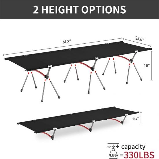 A: La cómoda cama plegable Disaster Relief ofrece dos opciones de altura: modo bajo para carpas o terreno firme (6,7 pulgadas/17 cm) y modo alto para césped, barro o terreno húmedo (15,7 pulgadas/40 cm).