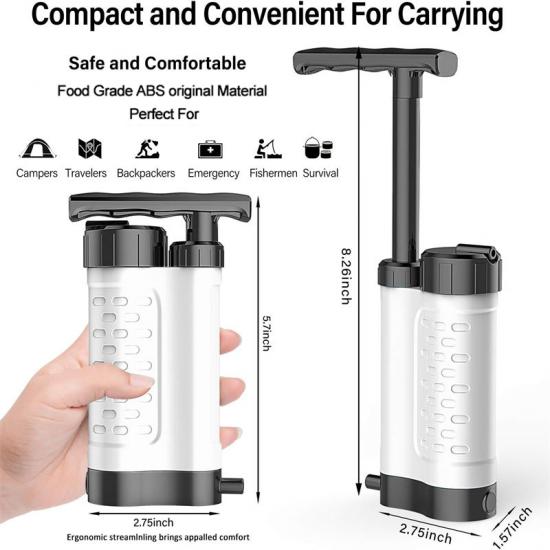 Este purificador de agua de 14,4 x 7,8 cm para desastres civiles ofrece una excelente capacidad de filtración para eliminar por completo las impurezas y sustancias nocivas de su fuente de agua, garantizando así la pureza de cada sorbo. Además, cuenta con un caudal muy rápido, que produce 1500 ml (1,5 litros) de agua pura por minuto, para que no tenga que esperar demasiado durante sus actividades al aire libre.