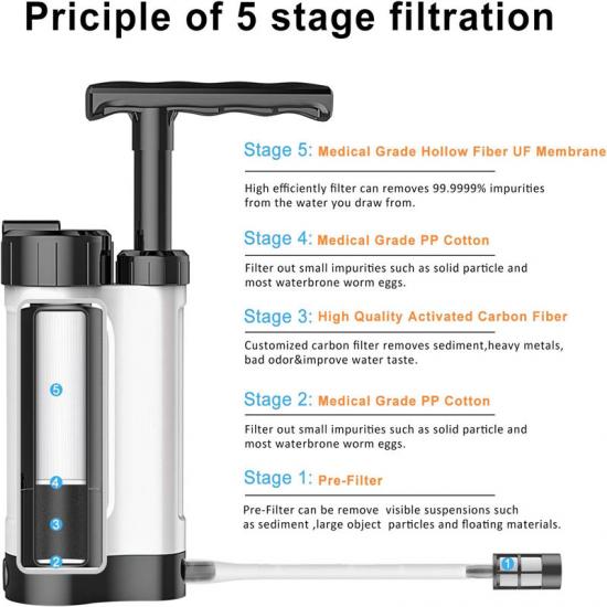 El sistema de filtración central del purificador de agua para desastres civiles de 8.3 x 1.6 pulgadas consta de una membrana de ultrafiltración de fibra hueca de grado médico y algodón PP, que trabajan en conjunto para eliminar eficazmente el 99.9999% del cloro, metales pesados, contaminantes químicos, sedimentos y otras partículas del agua. Además, para mejorar aún más la filtración, hemos añadido carbón activado de cáscara de coco de alta calidad, que puede adsorber y eliminar olores y sustancias nocivas del agua, proporcionándole agua potable pura y saludable.