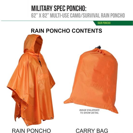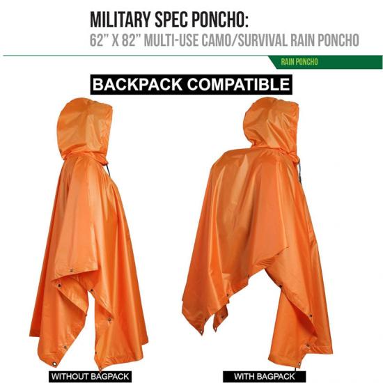 Un poncho impermeable es un equipo ideal en situaciones de emergencia ante desastres y uso militar. Cuando el clima cambia repentinamente y llueve a cántaros, proporciona una capa seca y protectora que evita que el agua de lluvia penetre en tu equipo y ropa. En situaciones de supervivencia de emergencia, proporciona refugio y calidez, mientras que gracias a su versatilidad, se puede utilizar como sombrilla, herramienta de recolección de agua, camilla de transporte de emergencia y más.