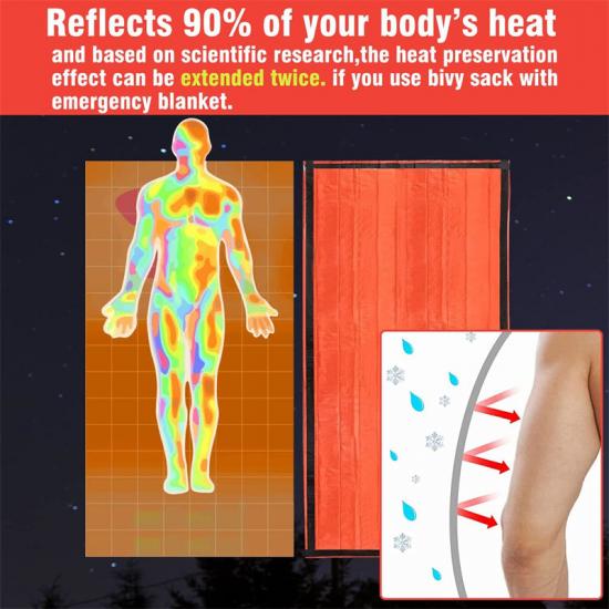 El tejido interior del saco de dormir transpirable Emergency Rescue está fabricado con un material reflectante único que refleja y retiene eficazmente el calor corporal, ayudando a los usuarios a mantenerse calientes en las noches frías. Además, el diseño de costuras selladas no solo aumenta la durabilidad del saco de dormir, sino que también bloquea eficazmente la lluvia, el viento, la nieve y otros factores externos. Además, el uso de materiales transpirables evita la condensación en el interior del saco de dormir, garantizando así la comodidad.