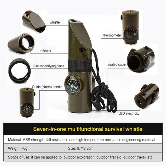 equipo, como mantas de emergencia, tijeras, silbatos y tarjetas de bolsillo multifunción, Presionando la luz del flash.