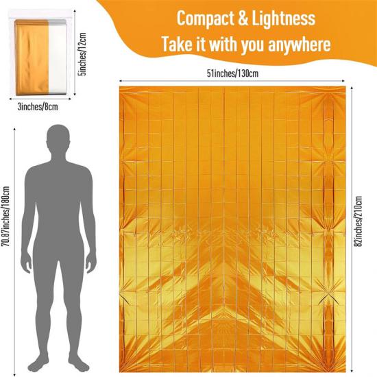 Esencial para la supervivencia: Este Producto de emergencia La manta de aluminio de película aluminizada de PET es un kit de supervivencia práctico y bien diseñado. Está hecha de una resistente película aluminizada de PET con un tamaño moderado de aproximadamente 210 x 130 cm (82 x 51 pulgadas), que cubre completamente el cuerpo, reteniendo el 90 % del calor corporal y previniendo la hipotermia y el shock. En caso de emergencia, esta manta resistente al calor proporciona calor y protección.