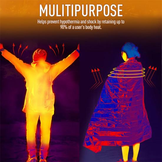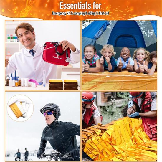 Versátil: Este Producto de emergencia La manta de aluminio, bien diseñada, tiene múltiples usos en caso de emergencia. Además de proporcionar calor, también puede usarse como saco de dormir, funda para mochila, poncho, señal de emergencia o toldo. Este kit de supervivencia le garantiza estar preparado para cualquier condición climática adversa. También puede reutilizarse como cabestrillo, forro para saco de dormir, barrera contra el viento, recolector de agua o señalizador de senderos. En operaciones militares, socorro de emergencia, ingeniería de proyectos o respuesta a desastres a gran escala, esta manta aislante puede desempeñar un papel importante.