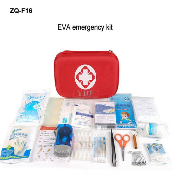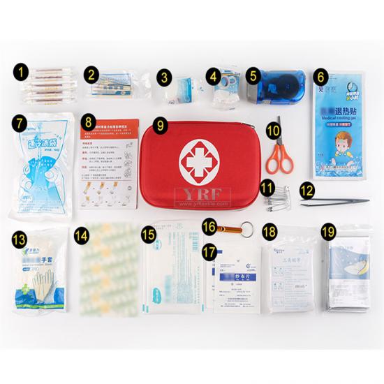 Toallitas húmedas * 10 piezas / bolsa, Mascarilla * 5, Vendaje triangular * 1, Sábana de algodón yodóforo * 10, Tabletas de alcohol * 20, Parche antipirético * 1, Tira fina elástica PBT * 1, Mascarilla de RCP * 1, Esencia de aceite de viento * 1, Gasa * 2, Cinta * 1, Parche de vendaje * 12, Hisopo de algodón * 1, Imperdible * 10, Pinzas 1, Torniquete * 1, Tijeras * 1, Paquete educativo urgente * 1