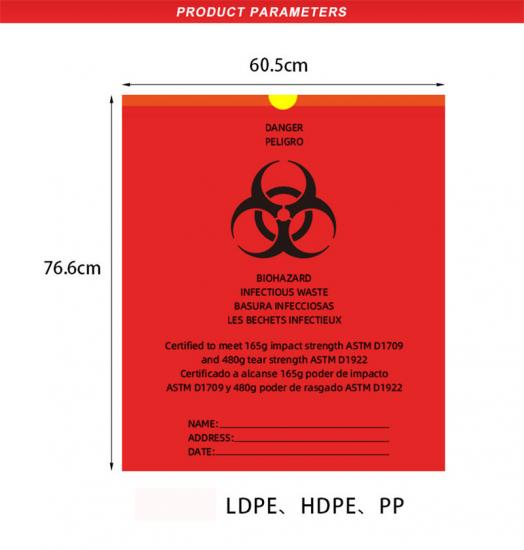 Hecho de material de polietileno de alta densidad (HDPE) de grado médico, con una densidad de 0,95 g/cm³, espesor 0,07 mm, resistencia a la tracción ≥34 MPa, resistencia a la perforación ≥320 g, buena tenacidad del material, no se daña fácilmente, lo que proporciona una garantía confiable para el almacenamiento temporal de desechos médicos.