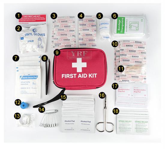 Instrucciones *1, guantes de PVC *1, curita mariposa *5, curita cuadrada *5, vendaje PBT *1, vendaje triangular *1, gasa *5, pinzas *1, botiquín de primeros auxilios *1, curita rectangular *20, bolsa de hisopos de algodón *1, torniquete *1, cinta no tejida *1, imperdible *10, pastillas de alcohol *40, tijeras *1, pastillas de yodóforo *10, pastilla Zhiyang *10