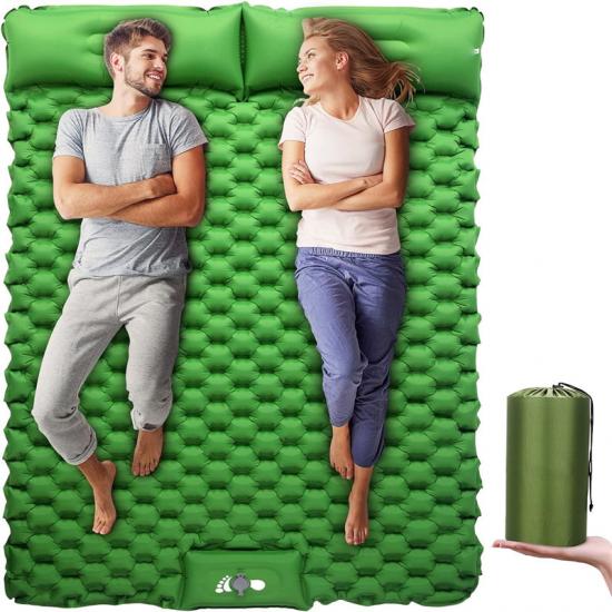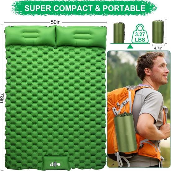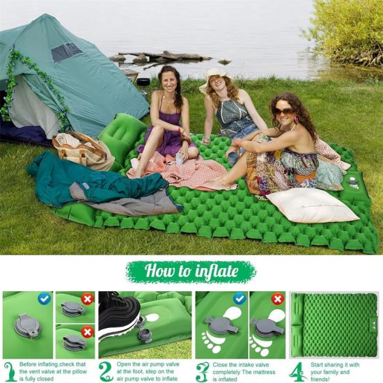 La colchoneta para dormir se puede inflar rápidamente, simplemente presione su pie en el punto de inflado de la bomba incorporada y estará lista.