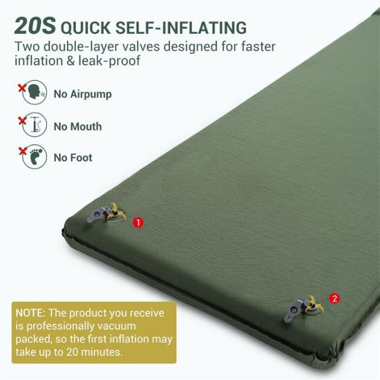 Nuestra espuma de alta densidad tiene propiedades de alta resiliencia que permiten que esta colchoneta para dormir se infle en menos de 20 segundos.