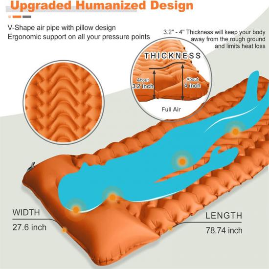 Nuestras colchonetas inflables para dormir, anchas y gruesas, cuentan con un diseño único en forma de V, diseñado ergonómicamente para