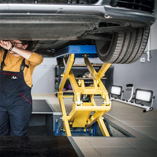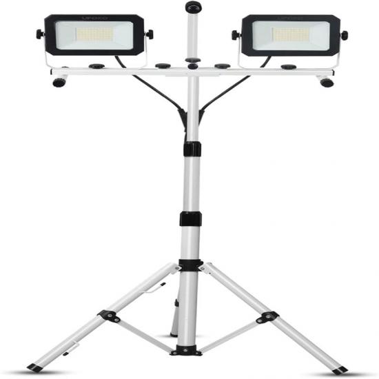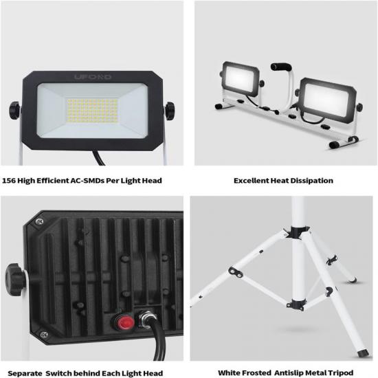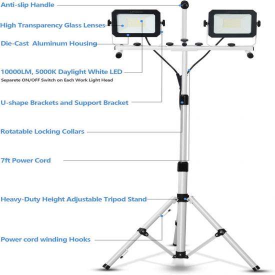 La luz de emergencia tiene 5000 lúmenes por casquillo y una luz blanca intermitente de 5000 K. El trípode telescópico se extiende de 84 a 178 cm. Cada cabezal puede girar 360° horizontalmente e inclinarse 270° verticalmente para ajustar el ángulo de iluminación deseado. La luz de trabajo de doble cabezal con asa se puede desmontar para uso independiente, eliminando la necesidad de un trípode.