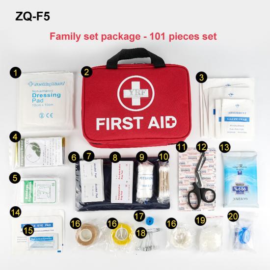 Almohadilla hemostática * 2, Botiquín de primeros auxilios * 1, Gasa (tres tamaños) * 6, Manta de primeros auxilios * 1, Vendaje triangular * 1, Bolsa de gel frío y calor * 1, Tabletas de alcohol * 20, Tabletas de yodóforo * 20, Vendaje PBT * 1, Bolsa de hisopos de algodón * 1, Curita impermeable * 25, Tijeras * 1, Toallitas desinfectantes con alcohol * 1, Parche ocular * 2, Ungüento antibiótico triple * 1, Vendaje adhesivo * 3, Torniquete desechable * 1, Imperdible * 10, Guantes desechables * 1, Mascarilla desechable de RCP * 1, Instrucciones de uso * 1