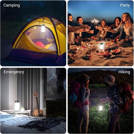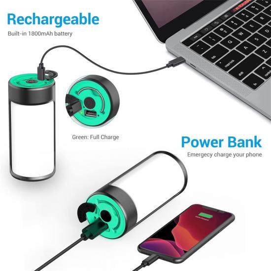 Clasificación de impermeabilidad IPX4 y batería recargable integrada de 1800 mAh, lo que elimina la necesidad de reemplazarla. Con un diseño de gancho en la parte superior, puedes colgarla de un árbol o dentro de una tienda de campaña para una mejor iluminación.