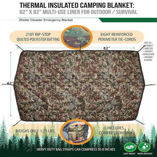 A: La manta forrada con impermeable se puede usar para diversos propósitos, como tiendas de supervivencia temporales, sombrillas, materiales de aislamiento para hamacas, almohadas, divisiones para tiendas de campaña, mamparas de privacidad, herramientas de transporte de emergencia, herramientas de socorro en caso de desastre, refugios ocultos, bolsos de transporte, sacos de dormir o materiales de aislamiento para tiendas de campaña.