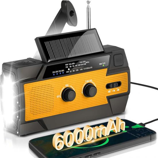 R: Esta radio de rescate duradera cuenta con una batería recargable de 6000 mAh, radio de 3 bandas, luz de emergencia con modo 3+2 y 4 modos de alimentación. Puede proporcionar energía de emergencia para teléfonos celulares, recibir transmisiones de la NOAA y cuenta con múltiples opciones de iluminación.