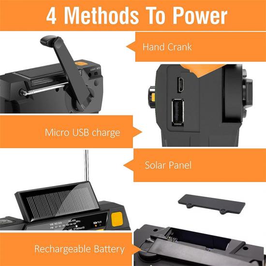 La radio de alta calidad Relief Rescue recibe 7 transmisiones de la NOAA y tiene acceso a canales AM FM para transmitir de manera profesional la información meteorológica más reciente y todo tipo de peligros para su área, como huracanes, incendios forestales, tormentas invernales, etc. La fuente de alimentación extraíble de 4000 mAh proporciona suficiente energía de emergencia para varios teléfonos móviles para hacer llamadas telefónicas importantes a miembros de la familia o para solicitar ayuda en caso de emergencia.