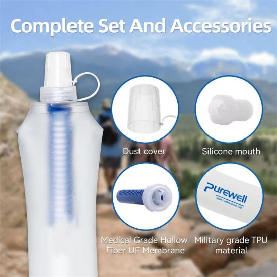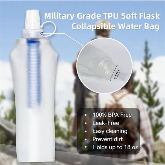 A: Purificadores de agua de 500 ml El purificador de agua está hecho de materiales de alta calidad, incluido un cuerpo de material de TPU suave de grado militar y una boquilla de silicona de grado médico.