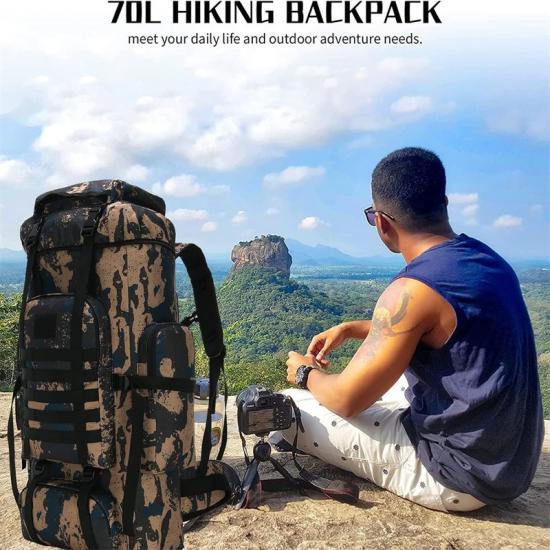 Esta mochila está hecha de tela Oxford 900D resistente, capaz de soportar cargas pesadas. Con una capacidad de 70 L, ofrece espacio suficiente para guardar todo tu equipo y artículos esenciales.