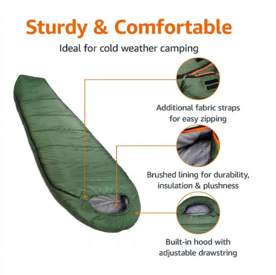 A: El saco de dormir Rescuel 100% poliéster tiene una cinta contrastante para evitar que la cremallera quede atrapada en la tela y un diseño de fibra hueca de doble capa para mantener el cuerpo cálido y retardar la pérdida de calor en climas fríos.