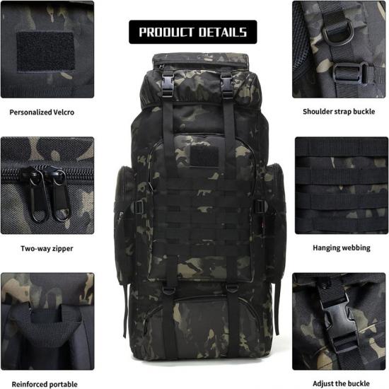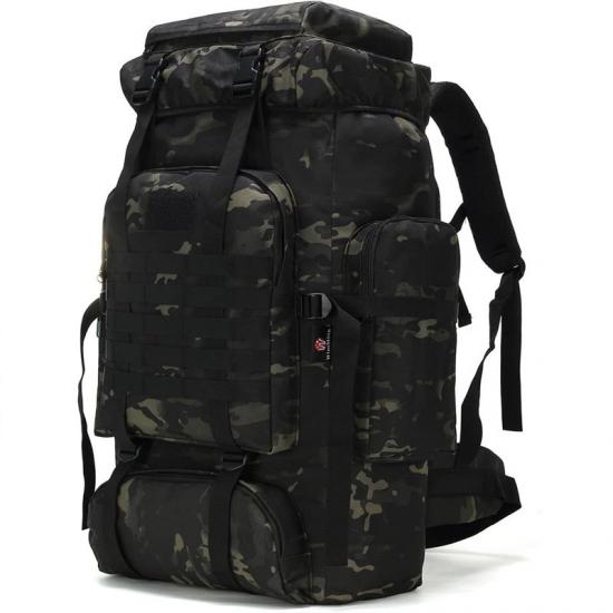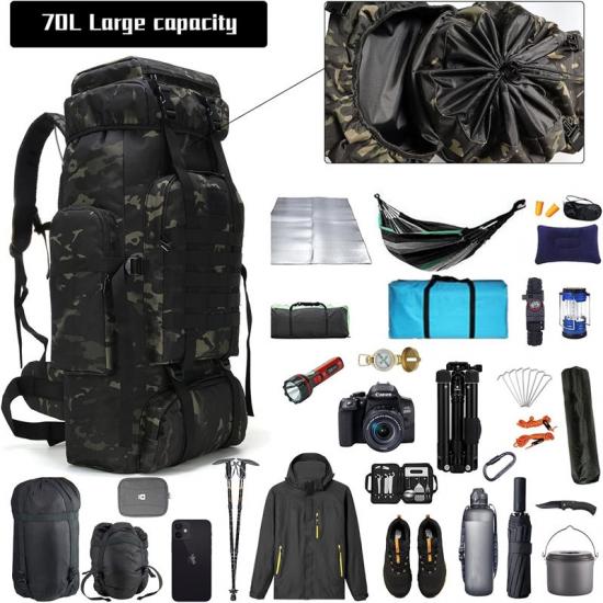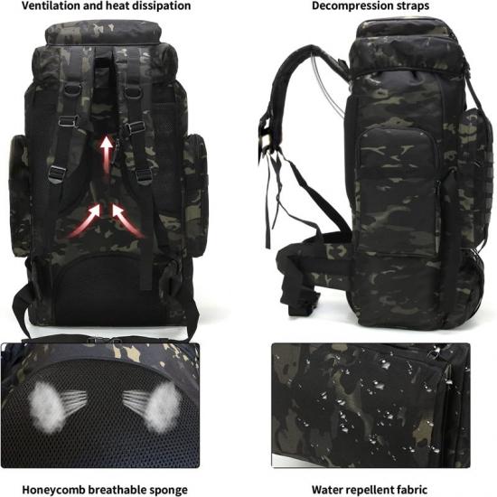 Esta mochila está hecha de tela Oxford 900D resistente, capaz de soportar cargas pesadas. Con una capacidad de 70 L, ofrece espacio suficiente para guardar todo tu equipo y artículos esenciales.