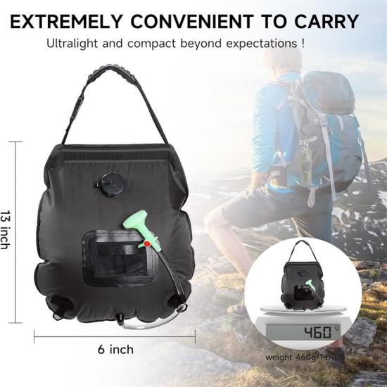 Esta bolsa de ducha solar portátil para exteriores está hecha de material de PVC no tóxico y tiene capacidad para hasta 5 galones de agua. Calienta el agua y utiliza energía solar. La abundante luz solar permite que el agua en la bolsa se caliente hasta 45 o 113 ° F.