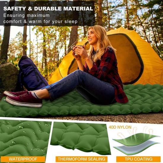 Nuestra colchoneta inflable para dormir está hecha de nailon grueso de 40d para mayor durabilidad y peso moderado. Desinflado rápido. Rescate.